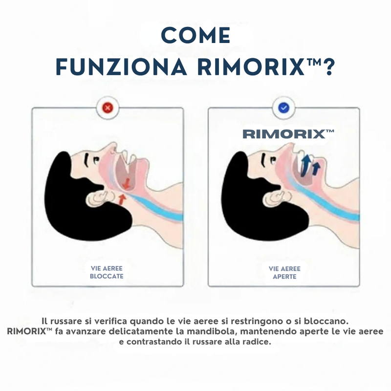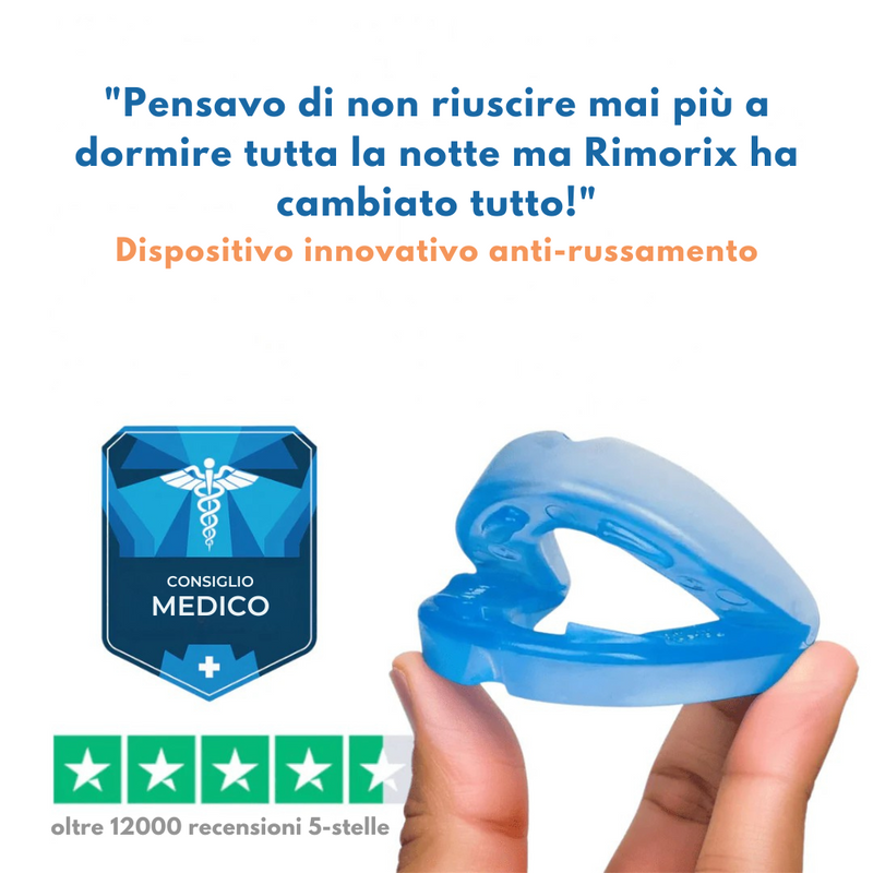 Il bite antirussamento Rimorix agisce riposizionando delicatamente la mandibola, mantenendo le vie respiratorie aperte durante il sonno. Questo consente un flusso d’aria libero, riducendo il russare fin dalla prima notte. È leggero, rimane saldamente in posizione per tutta la notte e ti aiuta a respirare in modo naturale, garantendoti un sonno migliore senza fastidi.